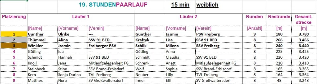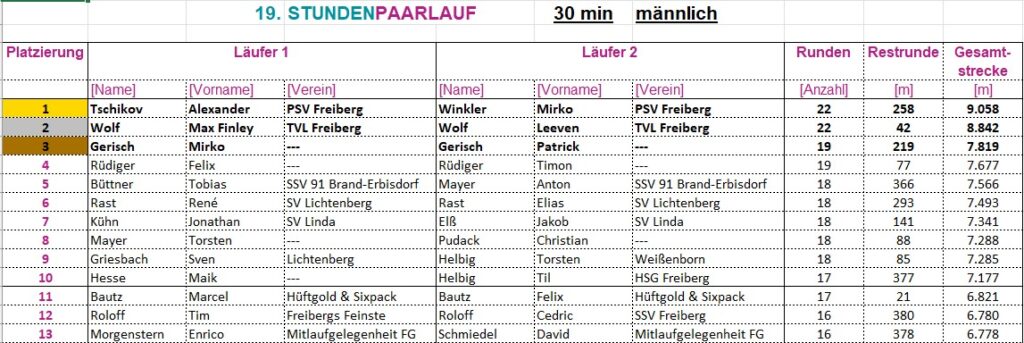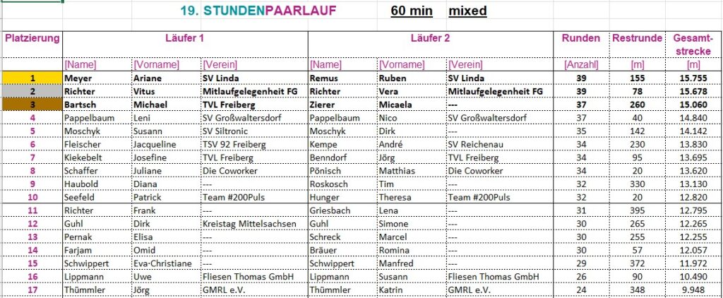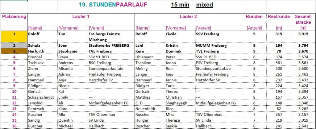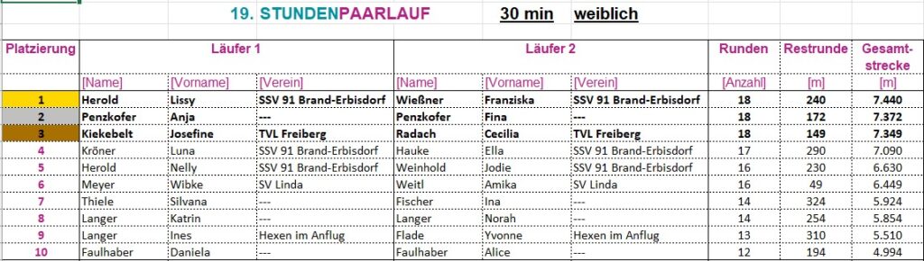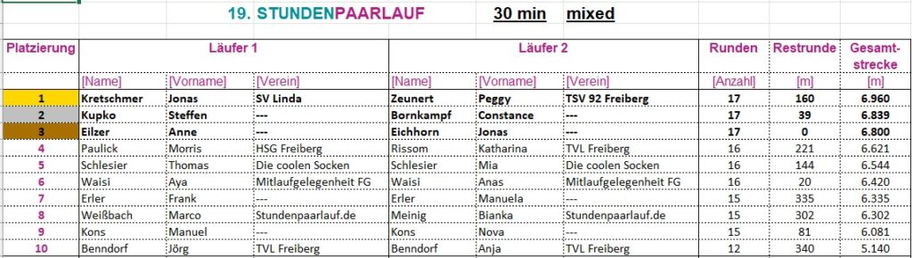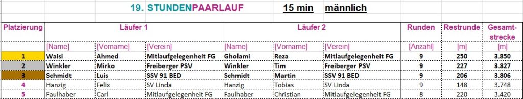 Gelaufen wird als Laufpaar, „männlich“, „weiblich“ oder „Mixed“. Es werden die Runden gezählt, nach Ablauf der jeweiligen Laufzeit die restlichen Meter dazu gerechnet.