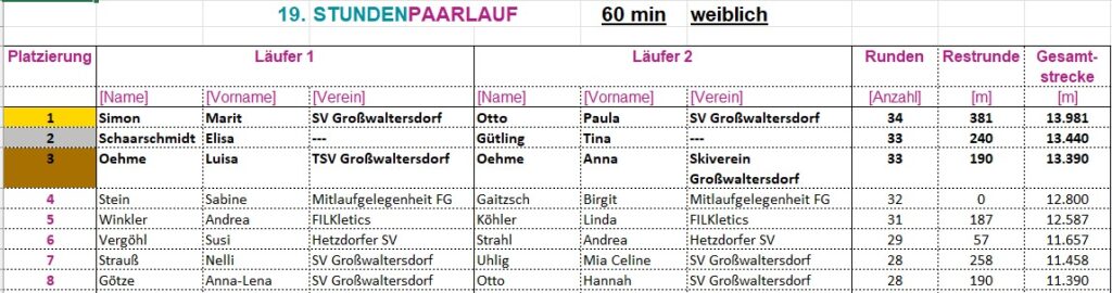 Die Sieger der halben und ganzen Stunden mit den meisten gelaufenen Runden erhalten in der Kategorie weiblich, gemischt und männlich einen Pokal.